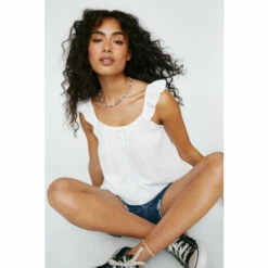 Get on top. Style yours denim shorts and canvas converse. Premium Modal Texture Gauze Swing Cami Top Loose Fit Straps with Ruffle Detailings Scoop Neck Textured Fabric Model wears size M (US size 6/UK size 10).