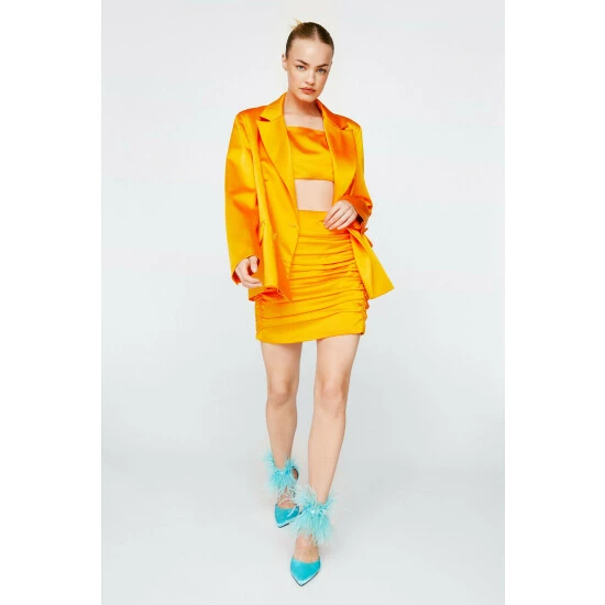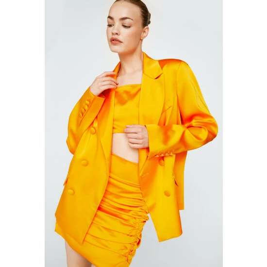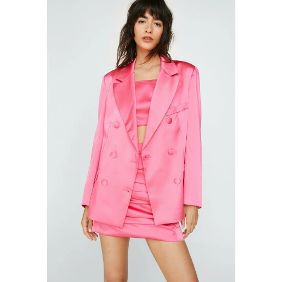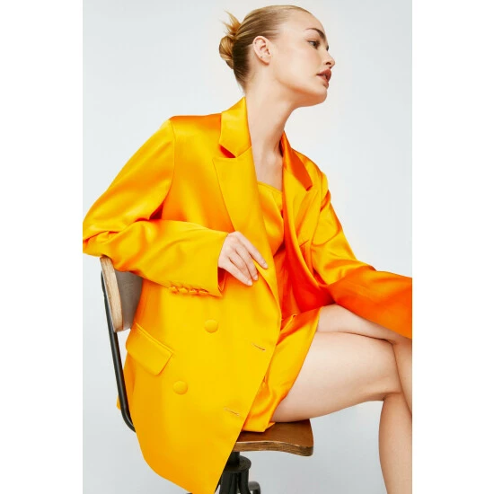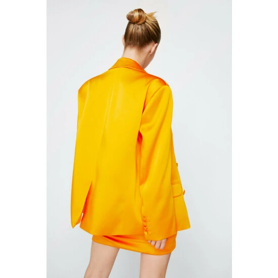 Style: BlazerFabric: SatinLength: LonglineNeckline: CollaredSleeve Length: Long Sleeve