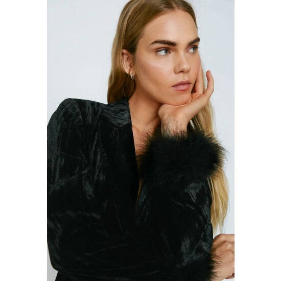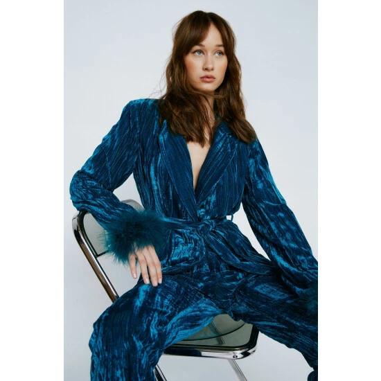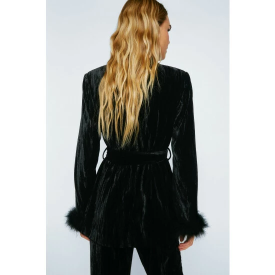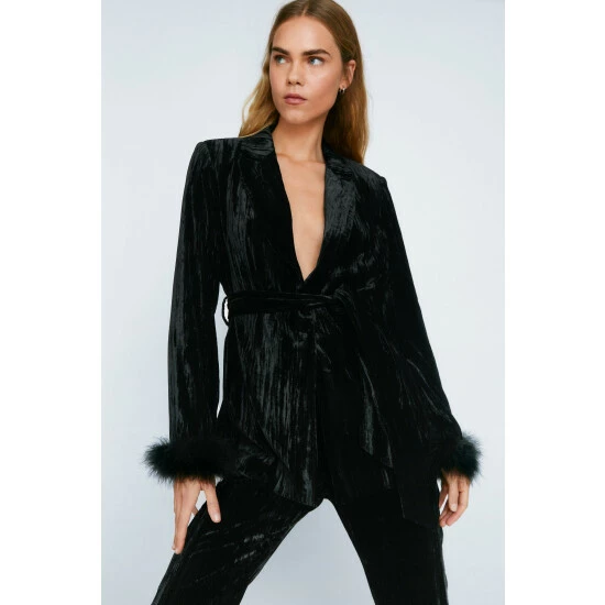 A twist on the traditional. Feel luxurious in our velvet blazer, with delicate feather cuffs and tie waist detailing. Premium Velvet Feather Cuff Tie Waist Blazer Velvet Blazer Tie Waist Blazer Feather Cuffs Plunge Neckline Belted Tie Waist Fastening Model wears a size M (US size 6/UK size 10).