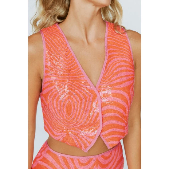 Making waves. Complete the look by styling with the matching mini skirt and a pair of chunky sneakers. Premium Wave Sequin Vest Figure-Hugging Silhouette Cropped Length Sleeveless Style V-Neckline Asymmetric Hemline Concealed Closures on Front All-Over Sequin Embellishments Wave Design Comfortable Woven Lining Model wears size M (US size 6/UK size 10). Item sold separate.