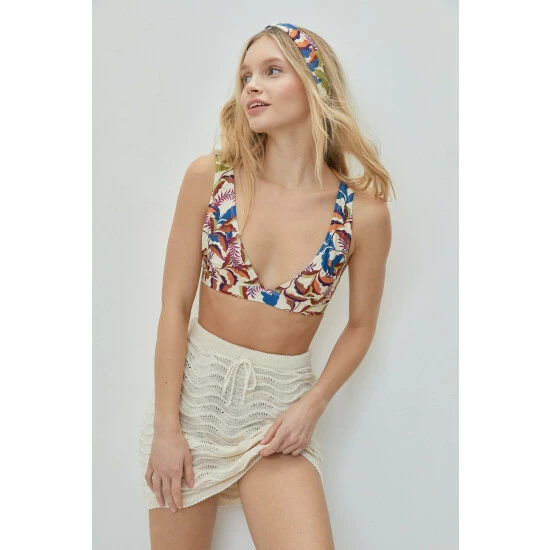 All Things Considered by Nasty Gal is our collection of sustainable pieces each thoughtfully considered and crafted with the world in mind. This bikini top features a V neckline, fitted, cropped silhouette, lace up bow tie closures at side, square neckline at back, straps with bow tie closures, floral print throughout, and clip closure at back. The matching bikini bottoms feature a high leg silhouette, bow tie closures at sides, and cheeky bottom coverage at back. Great for styling with a matching cover-up. Style: Recycled Leaf Tie Shoulder Crop Bikini Set Fit: Loose Length: Cropped Occasion: Swimwear Model is 5’8” and wears a size M (US size 6/UK size 10).