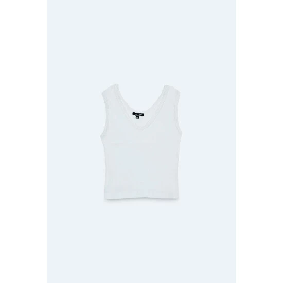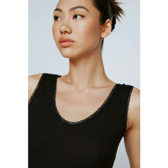 Everyday essentials. Feel cute in our tank top, with a minimal lace trim, high quality ribbed fabric, and a relaxed straight fit. Pairs well with jeans or shorts for a casual daytime look that you’ll keep coming back to. Ribbed Lace Trim Tank Top High Quality Ribbed Fabric Cropped Tank Top Cute Lace Trim Flattering V Neckline Model wears a size M (US size 6/UK size 10).