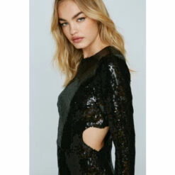Shining moment. Our sequin cut out jumpsuit is super sleek with a beautiful silhouette. Sequin Cut Out Skinny Long Sleeve Jumpsuit Sequin Jumpsuit High Neckline Zip Fastening in Back Sequin Material Side Cut Outs Bodycon Fit Long Sleeves Model wears a size M (US size 6/UK size 10).