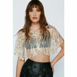 See it through. Our sequin embellished shawl is perfect for adding a little extra something to your look. Sequin Embellished Fringed Shawl Mesh Shawl Sequin Detailing Cropped Length Button Fastening at Neck Model wears a size M (US size 6/UK size 10).