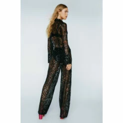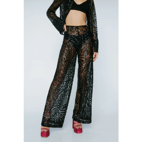 Wild child. Our sheer sequin animal print wide leg pants look great with the coordinating top and are perfect for parties, vacations, and nights out. Sheer Sequin Animal Wide Leg Pants Sequin Pants Wide Leg Pants Animal Print High Waisted Sequin and Mesh Fabric Model wears a size M (US size 6/UK size 10).