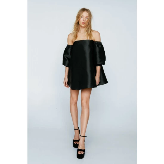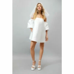 To have and to hold. Feel bridal in your own way in our alternative bridal dress, with a modern bardot neckline, off shoulder sleeves, and a relaxed fit. The mini length offers flirty vibes, while the puff sleeves bring a taste of the traditional to your look. Pairs well with chunky heels. Structured Bardot Puff Sleeve Mini Prom Dress Mini Bridal Dress Bardot Neckline Off Shoulder Sleeves Feminine Puff Sleeves Minimal Design Model wears a size M (US size 6/UK size 10).