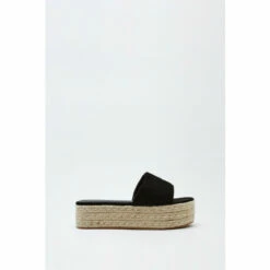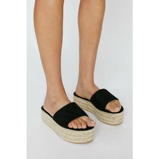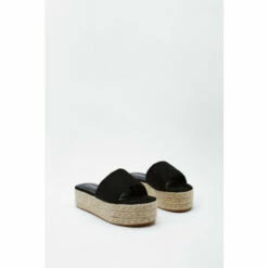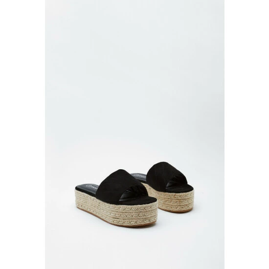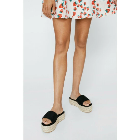 Summery slip ons. These shoes feature flatform soles, open toes, and a slide on design. Team with your favorite sundress on warm, balmy days. Suede Espadrille Flatform Sandals Exposed Heel Espadrille Style Suede Details Thick Front Straps