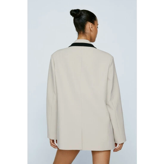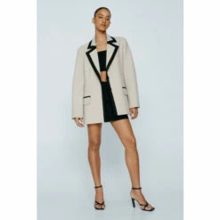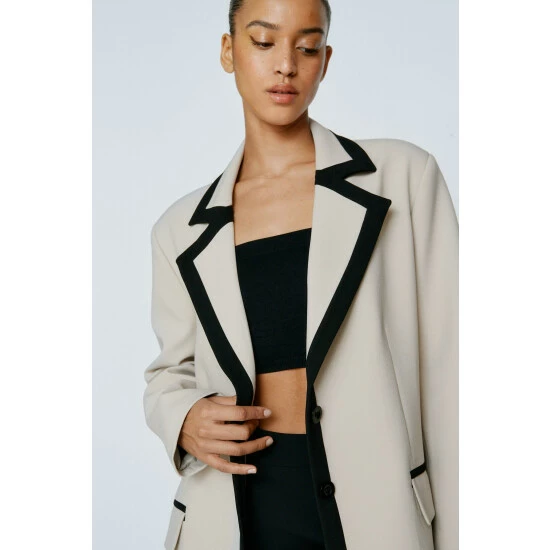 Block it out. Feel fancy in our tailored blazer, with an eye catching colorblock design, pocket detailing, and a classic silhouette. Pairs well with a mini skirt and bandeau top for an elevated evening look, or wear it with jeans for an elevated daytime look. Perfect for wearing from the office to after work dinner and drinks. Tailored Color Block Blazer High Quality Tailored Blazer Statement Colorblock Design Button Fastening Pocket Feature Model wears a size M (US size 6/UK size 10).
