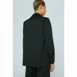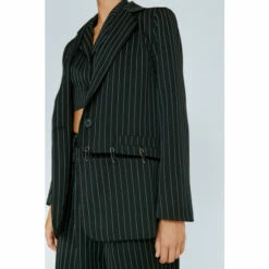 Corporate realness. Classic pinstripe blazer will take you from the office to happy hour. Single Breasted Blazer Pinstripe Blazer Edgy Safety Pin Detail Button Fastening Shoulder Pads Wear it with a matching two-piece, or pair with leather pants and a bandeau for a more casual look. Model wears size M (US size 6/UK size 10).