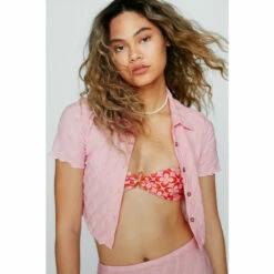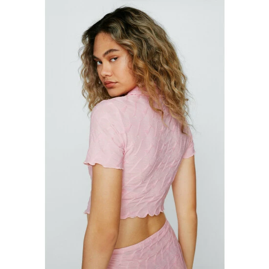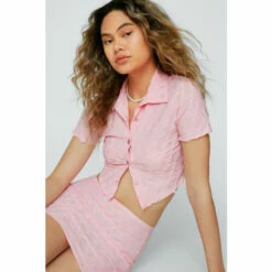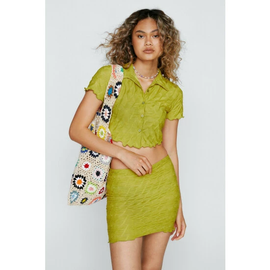 The 90’s are calling. The ‘I forgot to iron but make it cool look.’ Great for styling with the matching mini skirt and a crochet tote. Textured Cropped Fitted Shirt. Fitted Silhouette Lettuce Hem Short Sleeves Crinkle Textured Design Pointed Collar Button Up Closure at Front Cropped Length Model wears a US size 6/UK size 10. Item sold separate.