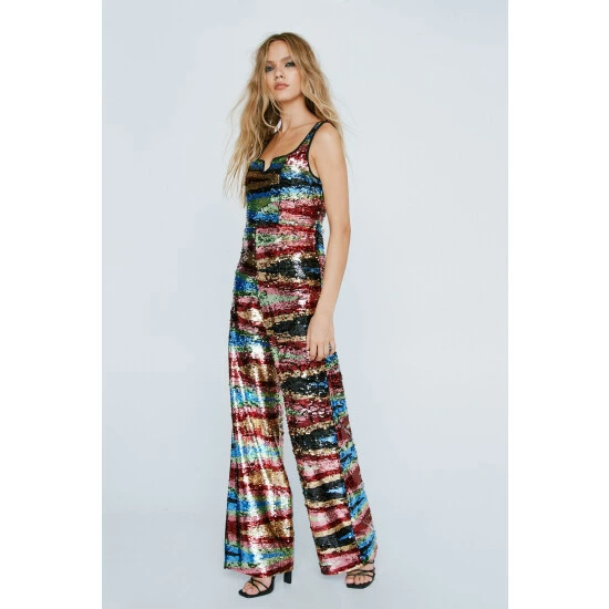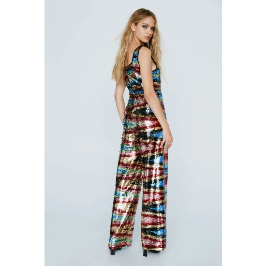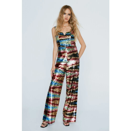 Shining moment. Our straight leg jumpsuit in sequin fabric is destined for nearby dancefloors. Zig Zag Printed Sequin Jumpsuit Sequin Jumpsuit V Notched Neckline Zip Fastening in Back Zig Zag Pattern Straight Leg Design Model wears a size M (US size 6/UK size 10).